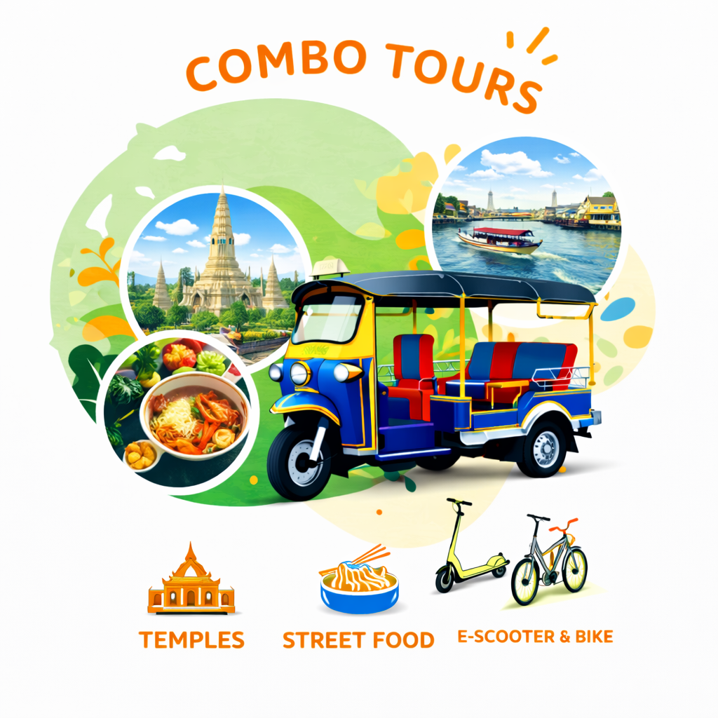 The first electric scooter tour company in Bangkok. Discover Bangkok’s hidden backstreets and river shores with Bangkok Funride. Choose between an electric scooter or a bicycle and explore the city in a fun, relaxed way. Have fun, keep calm and look cool! Discover Bangkok hidden backstreets and river shores with Bangkok Funride. Have fun, keep calm and look cool! Experience the soul of the old town by riding through the hidden backstreets along the canals through Wat Saket temple….Read more After a short ride along the canal in the old town and riding by the Chao Phraya Riverside, we will embark on a boat at….Read more After having crossed the Chaopraya River by riding on the famous Rama 8 bridge, we will go to discover and explore Bangkok Khlongs….Read more Located on the Chaopraya River, Koh Kret is a quiet island and a peaceful paradise for tranquility lovers….Read more For those who enjoy riding and visiting, this tour is made for you. We will go for 2 and a half hours of fun in the Old City….Read more Discovery of a haven of peace at the gates of Bangkok. Ko Kret is a rather special peaceful island whose inhabitants ….Read more Are you ready for a sunset ride to contemplate the beautiful colours of the Bangkok sky along the Chao Phraya riverside?….Read more We also offer Tuk-Tuk Tours in Bangkok. Discover Bangkok’s hidden backstreets and river shores with Bangkok Funride. Have fun, keep calm and look cool! Experience Bangkok like never before. Our combo tours bring together temples, street food, local rides and hidden gems in one unforgettable day. Time to kill in Bangkok and want to do something cool? Drop by, write us an email or give us a call. SAWASDEE !
